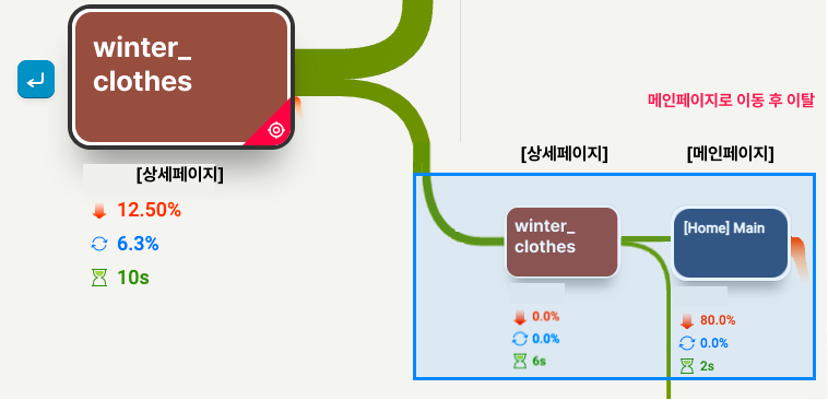 해당 여정은 상세페이지에서 메인 페이지로 이동 후, 다른 페이지를 탐색하지 않고 바로 이탈한 여정입니다. 이때 고객은 원하는 상품을 찾지 못했거나, 흥미를 잃고 사이트를 떠난 것으로 추측할 수 있습니다.