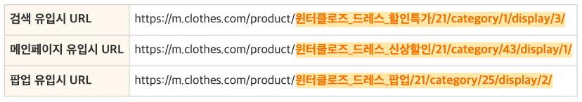 – 아래 예시와 같이 “겨울 원피스” 상품 상세페이지의 URL이 유입 경로에 따라 다른 경우, 여정이 모두 분산되어 있었습니다.