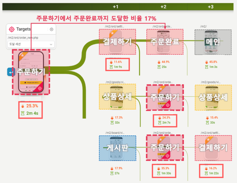 | 현황 파악 | Target 여정 확인 결과, [주문하기] 이탈률 25.3%로 주문 여정 중 가장 높으며, 체류시간 또한 2m 51s로 평균(49s)의 3배임을 확인하였습니다. |