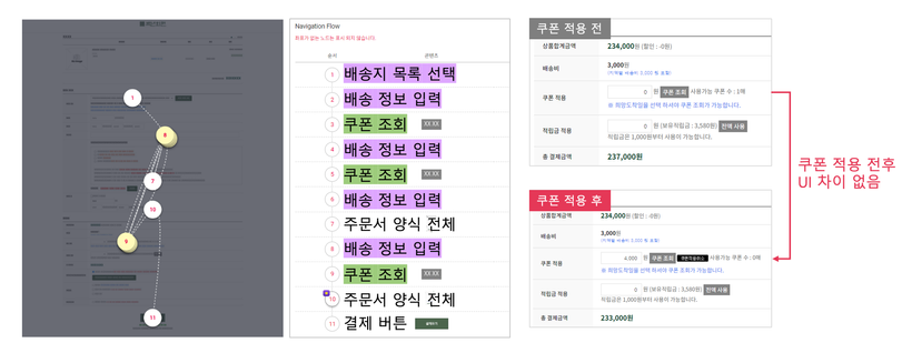 | 1) | 배송 정보 입력 도중 쿠폰을 조회하는 양상이 반복되고 있음 | 쿠폰 적용 전후 UI의 차이가 없기 때문에 실제 쿠폰이 적용된 건지 확인하기 위한 패턴으로 유추됨 | → 쿠폰이 적용됐음을 강조하는 UI로 수정 제안 (할인 금액을 다른 색상으로 표기 등) |