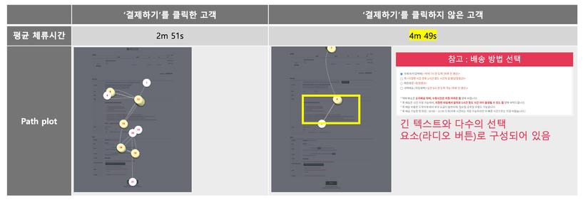 | 2) | ‘결제하기’ 버튼을 클릭하지 않은 고객의 체류 시간이 버튼을 클릭한 고객보다 더 길게 나타나며, 이탈 전 주로 배송 방법 선택란에 머물고 있음 | 현재 UI는 긴 텍스트와 다수의 선택 요소(라디오 버튼)로 구성되어 있으며, 현재의 UI가 고객에게 배송 방법 선택지를 제공함에 있어 다소 어려움을 느끼게 하는 것으로 유추됨 | → 배송 방법 UI 개선 제안 (줄글과 radio 버튼 대신 가독성이 좋은 배너 형태 등) |
