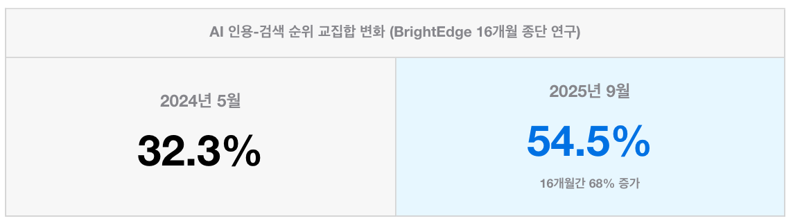이게 무슨 의미일까요? 검색 순위와 AI 인용은 별개라는 뜻입니다. 검색 1페이지에 없어도 AI가 인용할 수 있고, 검색 1위여도 AI가 인용하지 않을 수 있습니다.
