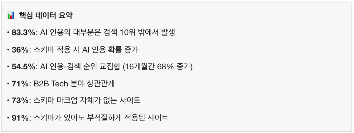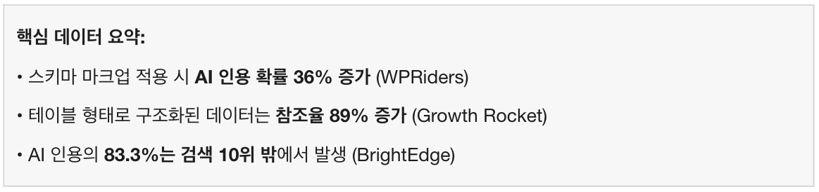 결론: AI는 ‘구조화된 정보’를 압도적으로 선호합니다. 검색 순위보다 스키마가 더 중요할 수 있습니다.