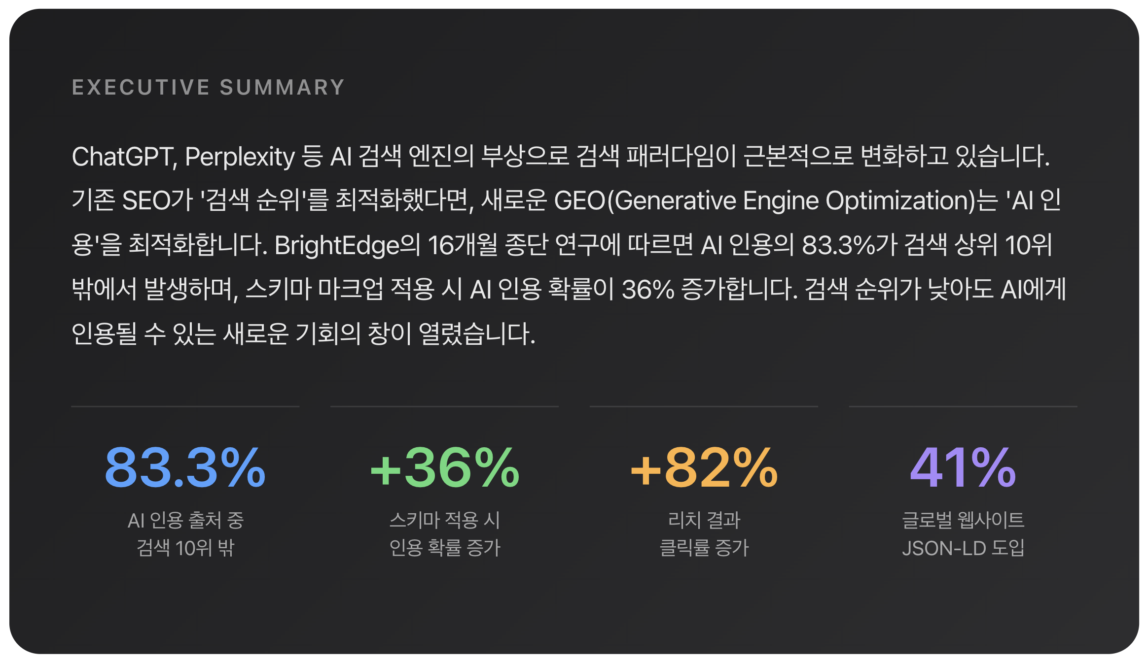 SEO만으로는 부족한 시대. AI 검색 엔진에게 ‘인용’되기 위한 GEO 전략과 스키마 마크업의 모든 것을 데이터 기반으로 분석합니다.