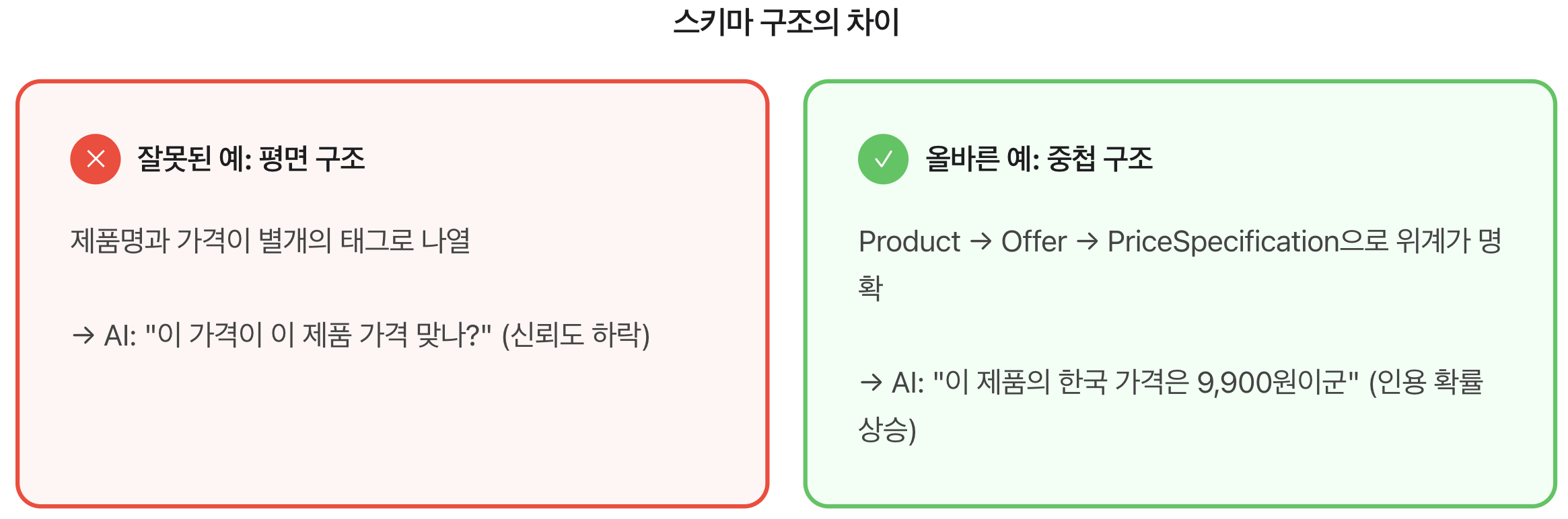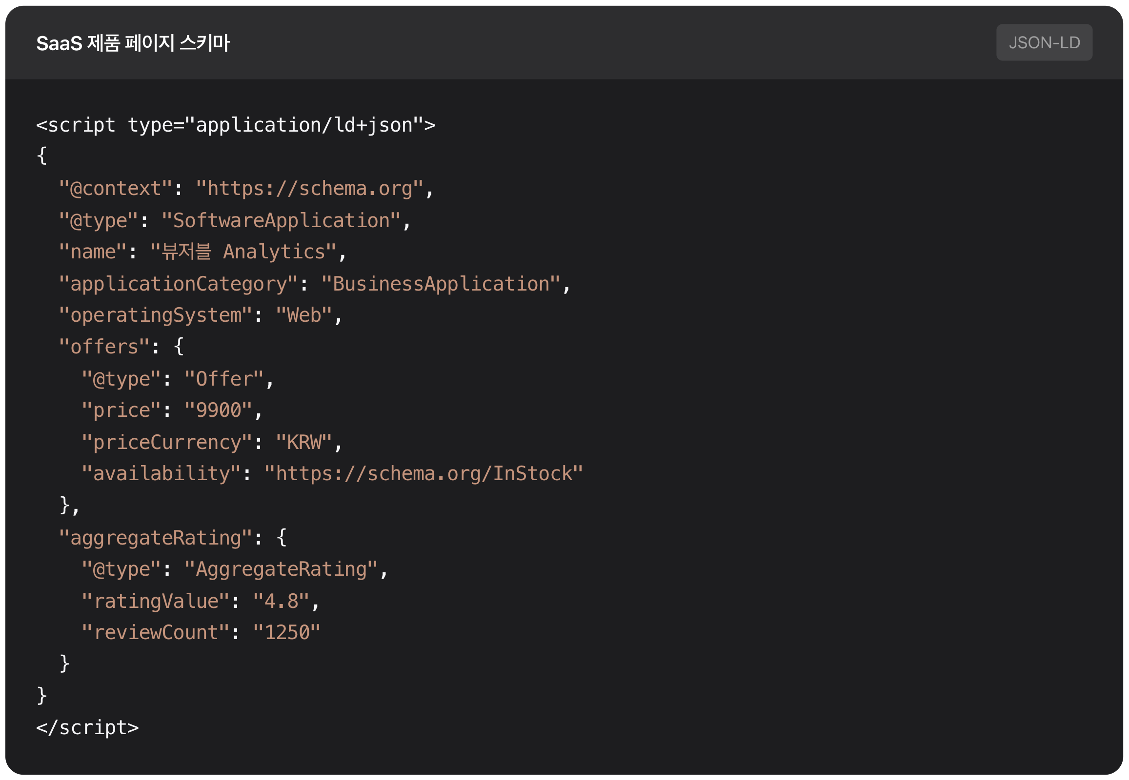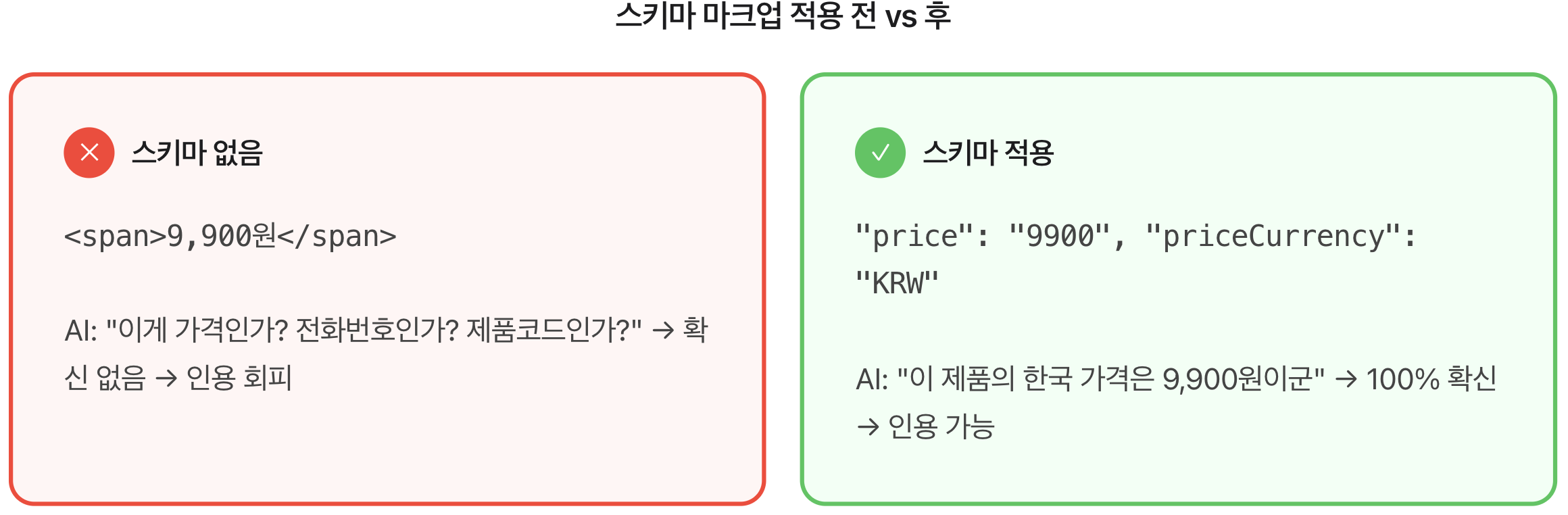 LLM(Large Language Model) 기반의 AI는 웹사이트를 텍스트 데이터의 집합으로 인식합니다. 우리가 “이것은 9,900원짜리 SaaS 제품이고, 이름은 뷰저블이며, 리뷰 평점은 4.8점입니다”라고 화면에 예쁘게 써놔도, AI는 그것이 가격인지, 전화번호인지, 아니면 단순한 숫자인지 확신하지 못합니다.