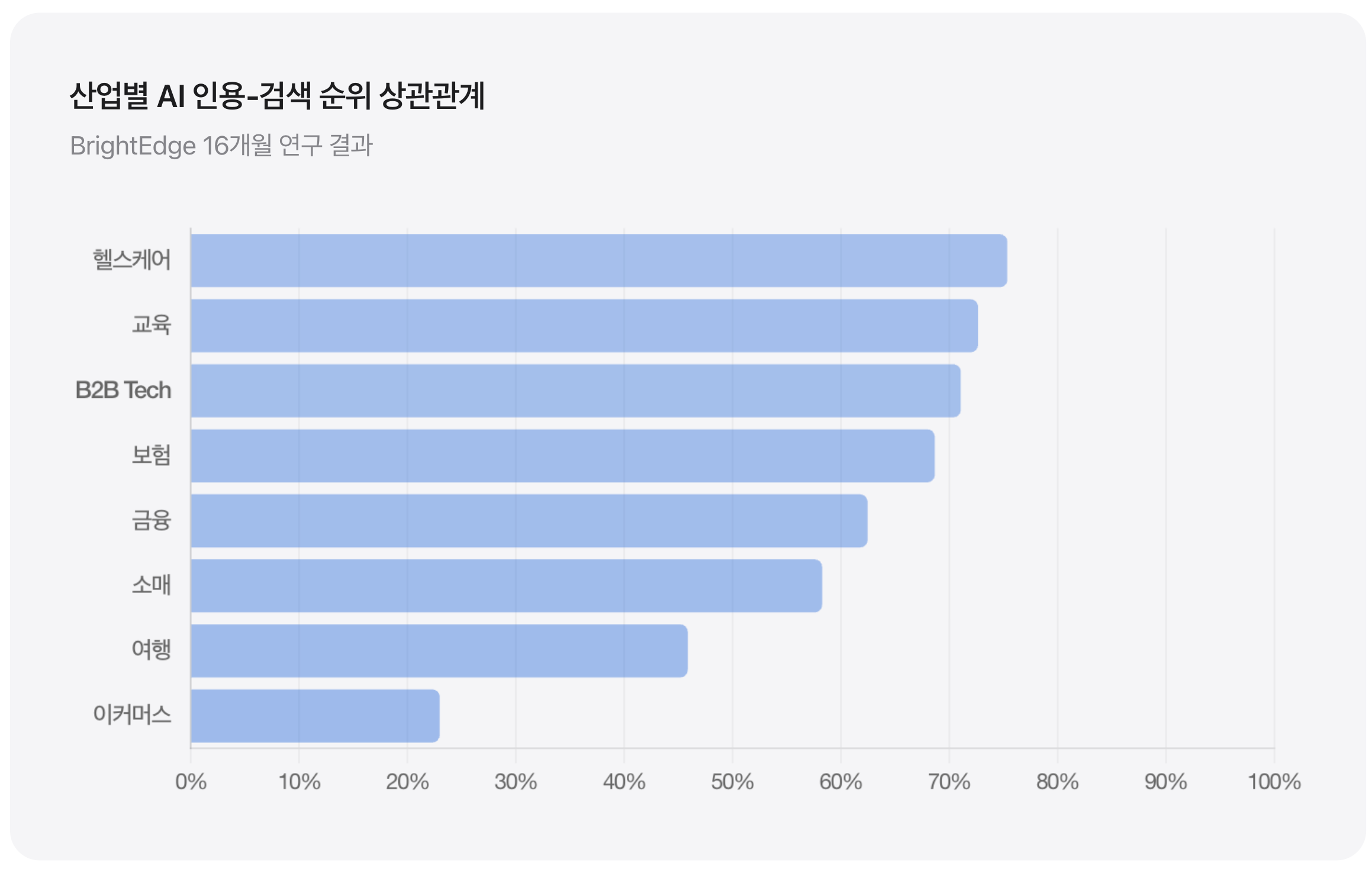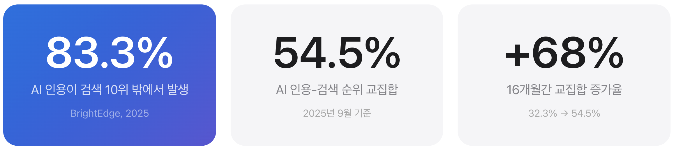 SEO 플랫폼 기업 BrightEdge는 2024년 5월부터 2025년 9월까지 16개월간 AI 검색과 기존 검색의 상관관계를 추적했습니다. 이는 현재까지 가장 포괄적인 GEO 관련 연구입니다.