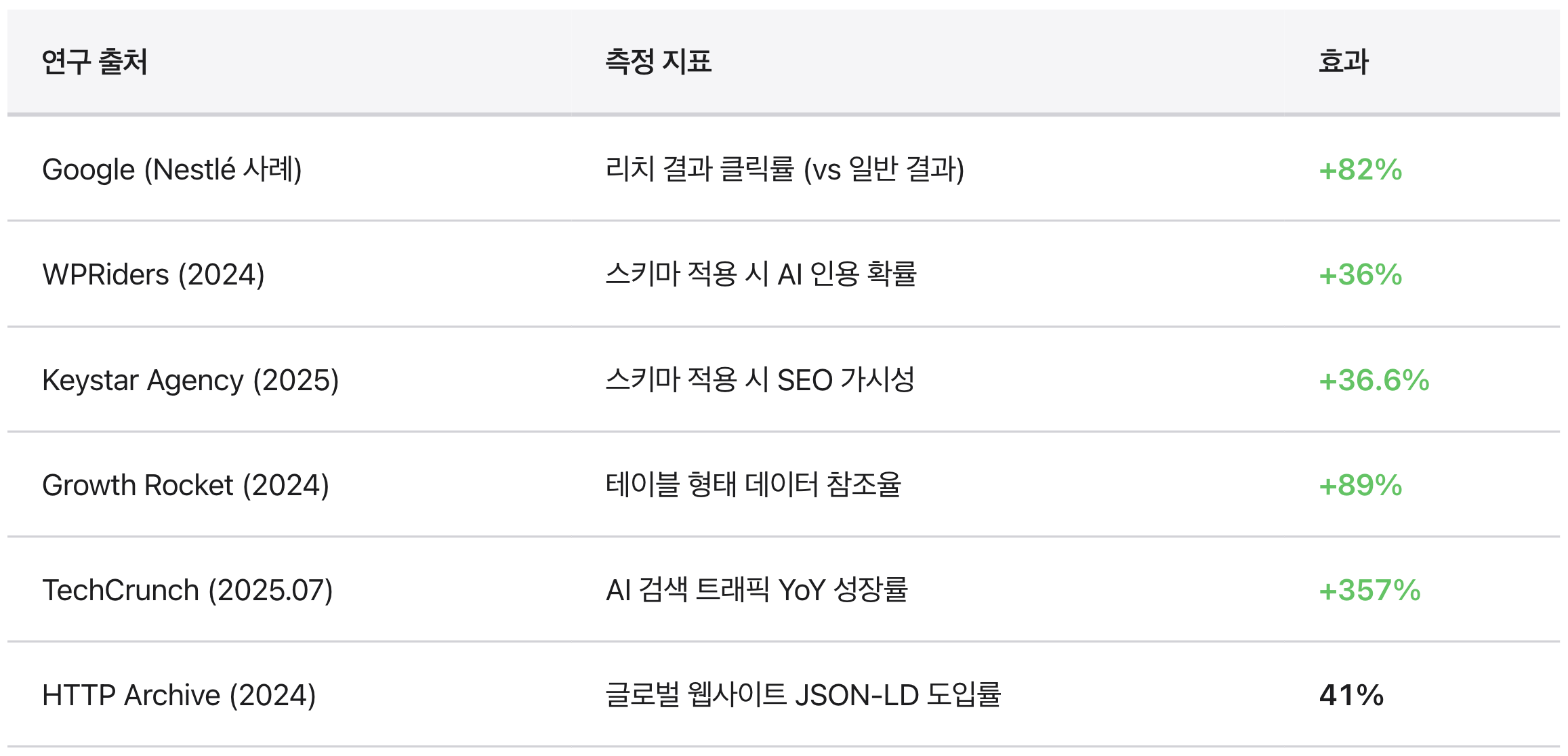 Google 공식 데이터에 따르면, 스키마 마크업이 적용되어 ‘리치 결과(Rich Results)’로 노출된 페이지는 일반 페이지 대비 클릭률(CTR)이 82% 더 높았습니다. 특히 AI 검색 트래픽이 전년 대비 357% 증가한 현재, 스키마 마크업은 선택이 아닌 필수입니다.