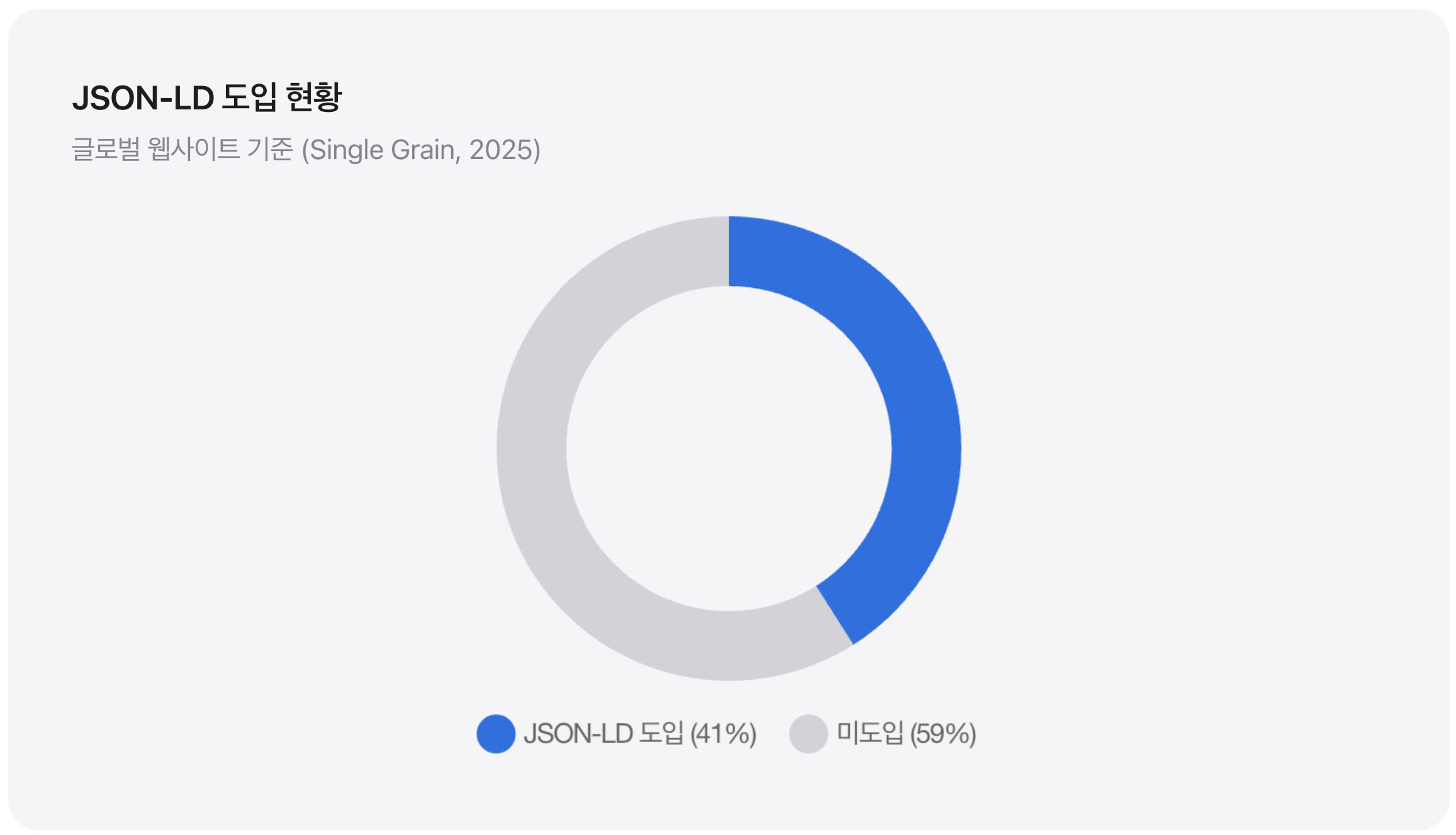 “아직 우리 경쟁사도 안 하는 것 같은데, 나중에 해도 되지 않을까?”라고 생각하신다면 재고가 필요합니다. Single Grain의 2025년 리포트에 따르면, 전 세계 웹사이트의 41%가 이미 JSON-LD 방식을 채택하여 AI 검색 생태계에 대비하고 있습니다.