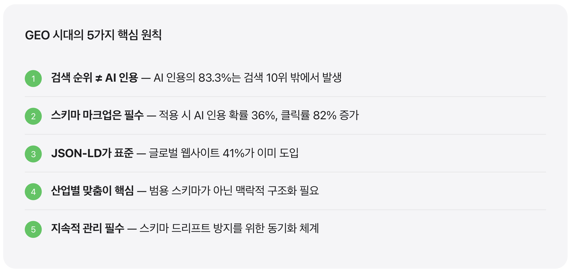 AI 인용의 83.3%가 검색 상위 10위 밖에서 발생합니다. 이는 검색 순위가 낮은 사이트도 스키마 마크업을 통해 AI에게 ‘발견’되고 ‘인용’될 수 있다는 것을 의미합니다. 검색 순위 50위 밖의 회사도 AI에겐 1등이 될 수 있습니다.