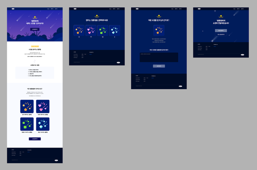 총 4개의 페이지로 이루어진 랜딩페이지로, 기본 구성은 헤더/메인콘텐츠/푸터로 구성했습니다. 메인 페이지에서는 별똥별에 소원을 빌 수 있는 CTA버튼과 하단에 소원을 비는 방법을 넣었습니다. 메인 페이지에서 유저들이 웹 페이지 기획에 대한 설명을 읽고 소원을 비는 과정까지 훑어보고자 했습니다.
