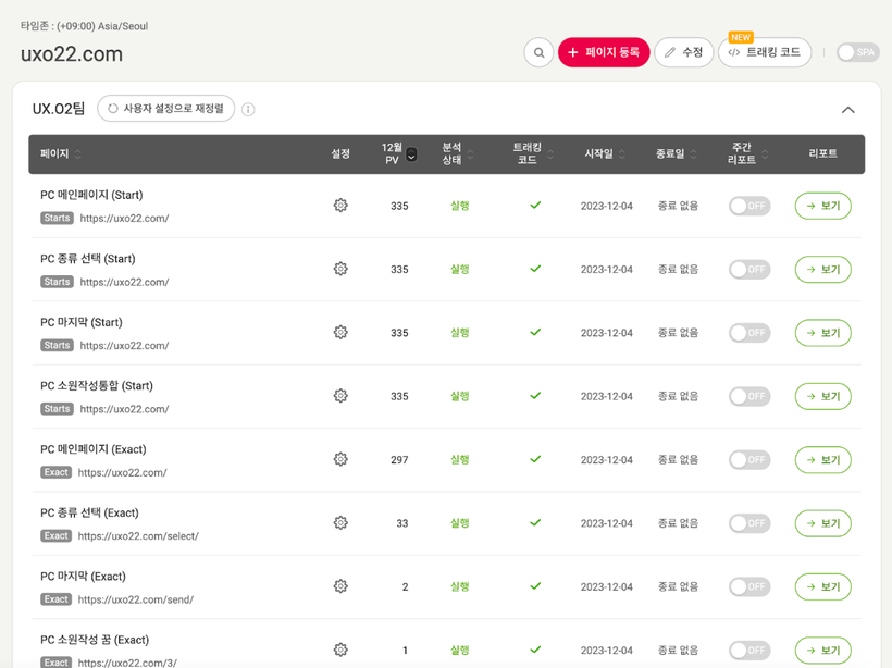 트래킹 코드를 넣고, 설치 확인을 한 후, 활성화까지 기다려주면 아래와 같이 대시보드에 페이지들이 뜨게 되고, 창을 클릭해주면 클릭 히트맵과 라이브 히트맵 등 해당 페이지의 데이터를 볼 수 있게 됩니다.