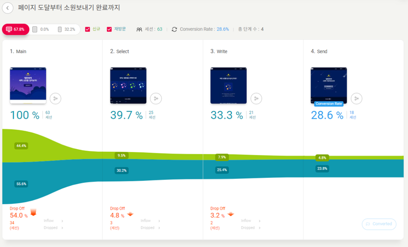 먼저 퍼널을 통해 페이지 도달부터 소원 보내기 완료까지 어떻게 여정을 거치는 지 분석해보았는데요, 이를 위해서 저희는 뷰저블 UX Heatmap의 기능 중 하나인 ‘Funnel’ 기능을 사용했습니다.