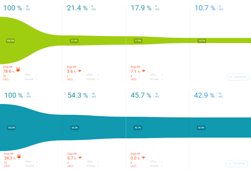 퍼널의 마지막 메인 기능은 세부 단계별 사용자의 잔존 및 이탈현황입니다. 각각의 단계에서 사용자가 어디로 잔존하는 지 혹은 이탈하는 지를 현황 그래프로 나타내 변화의 정도를 한 눈에 파악할 수 있다는 장점이 있습니다. 이를 통해서 어느 단계를 먼저 개선해야 하는지, 혹은 어느 단계가 가장 안정적인 전환율을 가지고 있는지 확인해볼 수 있습니다.
