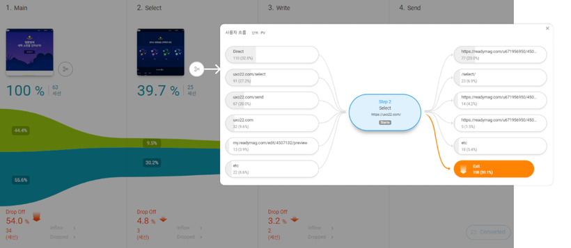 먼저, 설정한 단계별 사용자 행동흐름 분석이 가능한 기능입니다.
