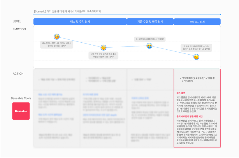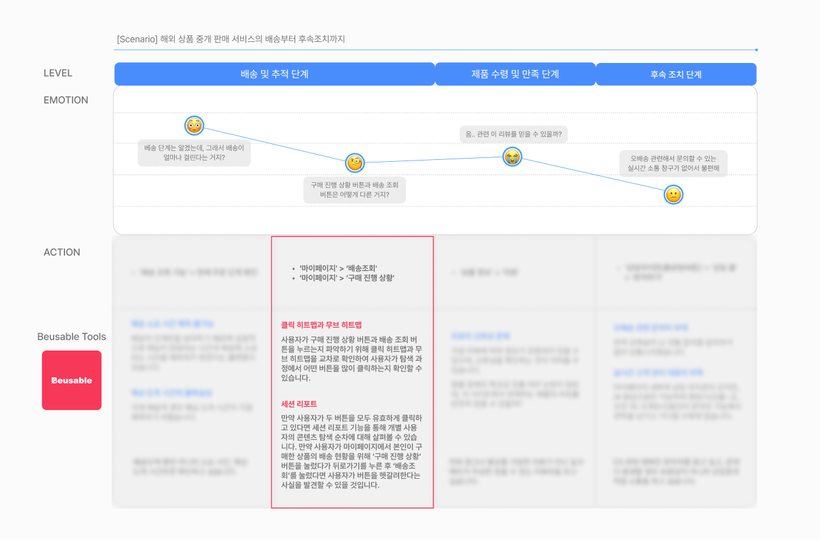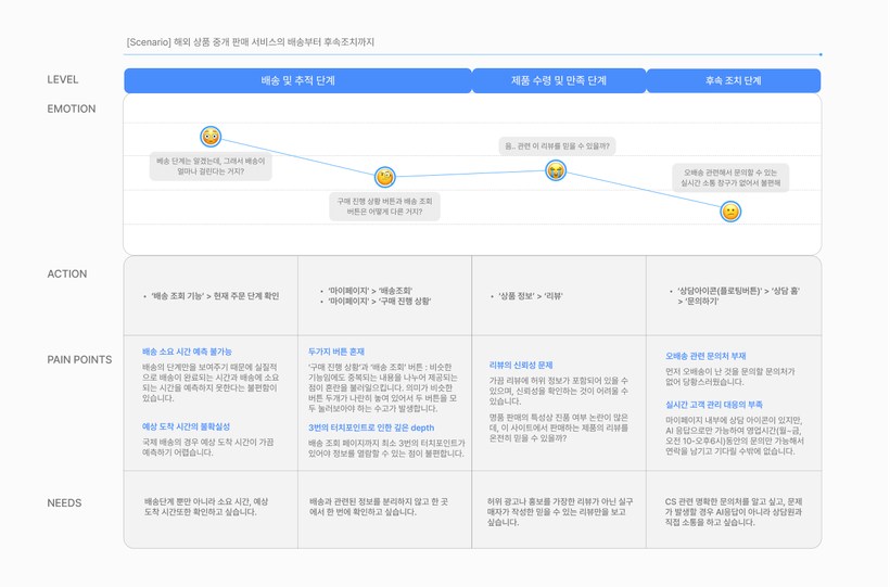 배송 및 추적 단계부터 교환, 환불과 관련된 후속 조치까지 ‘샌디’가 느낀 바를 사용자 저니맵을 통해 시각화 해보았습니다. 해당 저니맵을 바탕으로 해외 상품 중개 판매 서비스가 어느 부분에서 특히 고객 경험 관리에 신경을 써야 하는지 도출해 볼 수 있었습니다.