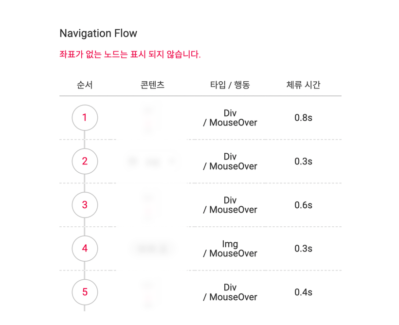 > 패스 플롯의 내비게이션 플로우 예시 화면이며, 유저가 어떠한 콘텐츠를 어느정도의 체류 시간을 가지고 탐색을 했는지 여정을 볼 수 있습니다.