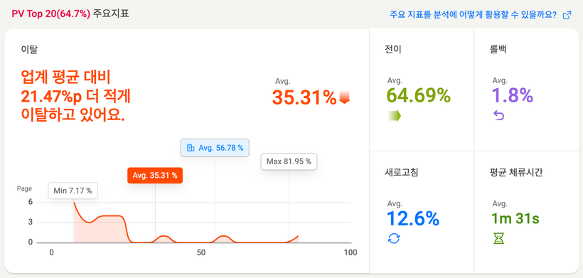 PV Top 20 평균 전환율과 각 페이지의 전이율을 비교하여 어떤 페이지가 특히 높은/낮은 전이율을 보이는지 분석할 수 있습니다.