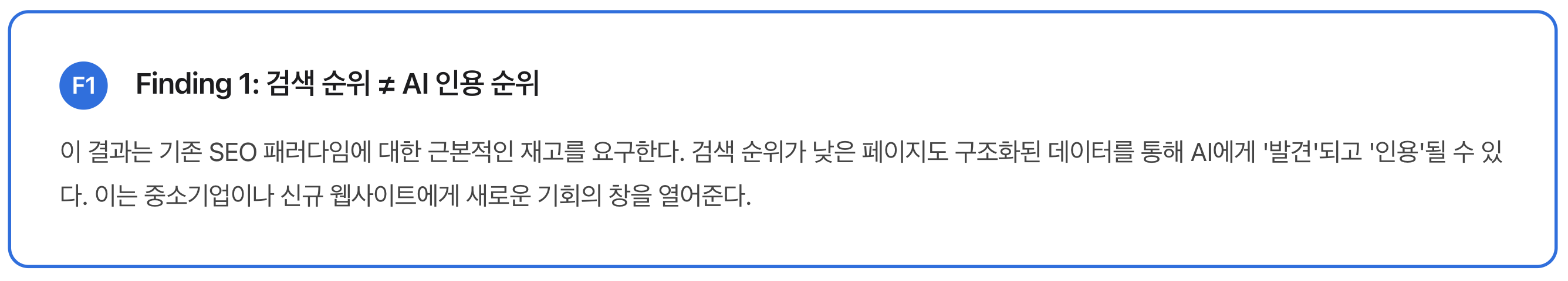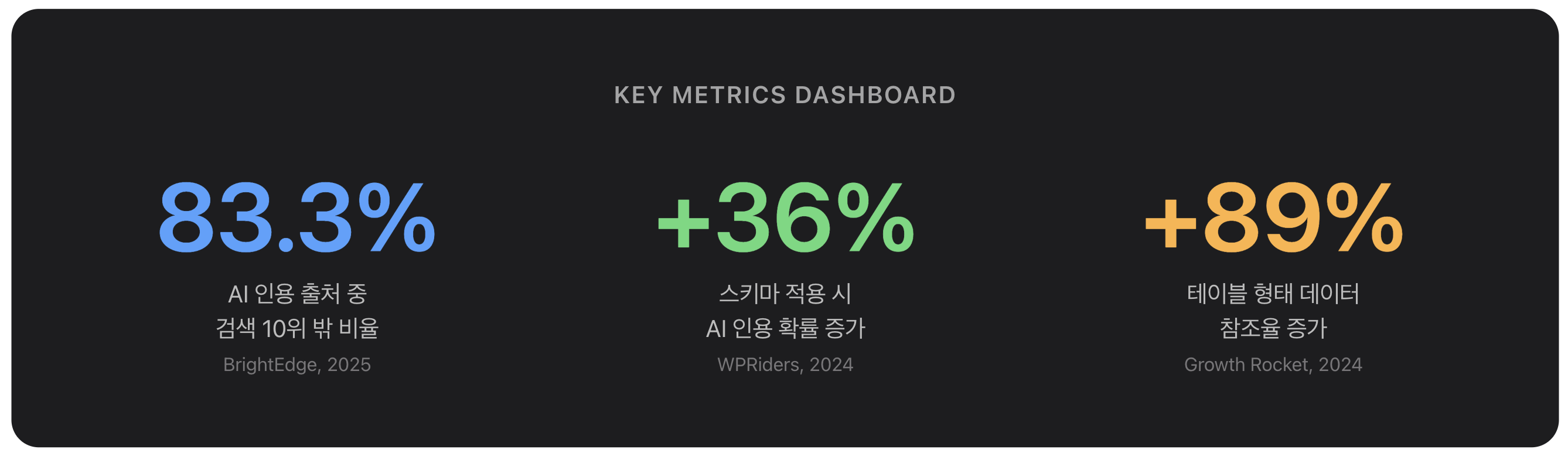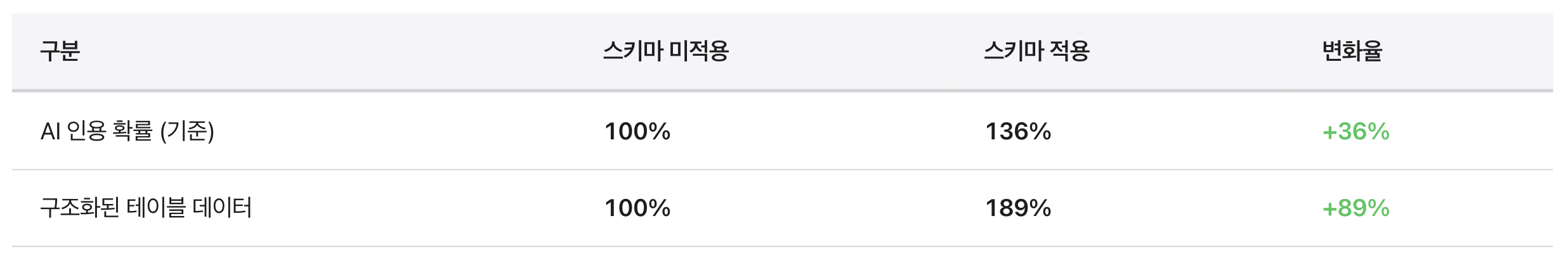 추가로 Growth Rocket(2024)의 분석에 따르면, 테이블 형태로 구조화된 데이터는 LLM이 정보를 참조하는 비율이 89% 더 높았다. 이는 AI가 ‘정리된’ 형태의 데이터를 선호한다는 것을 실증적으로 보여준다.