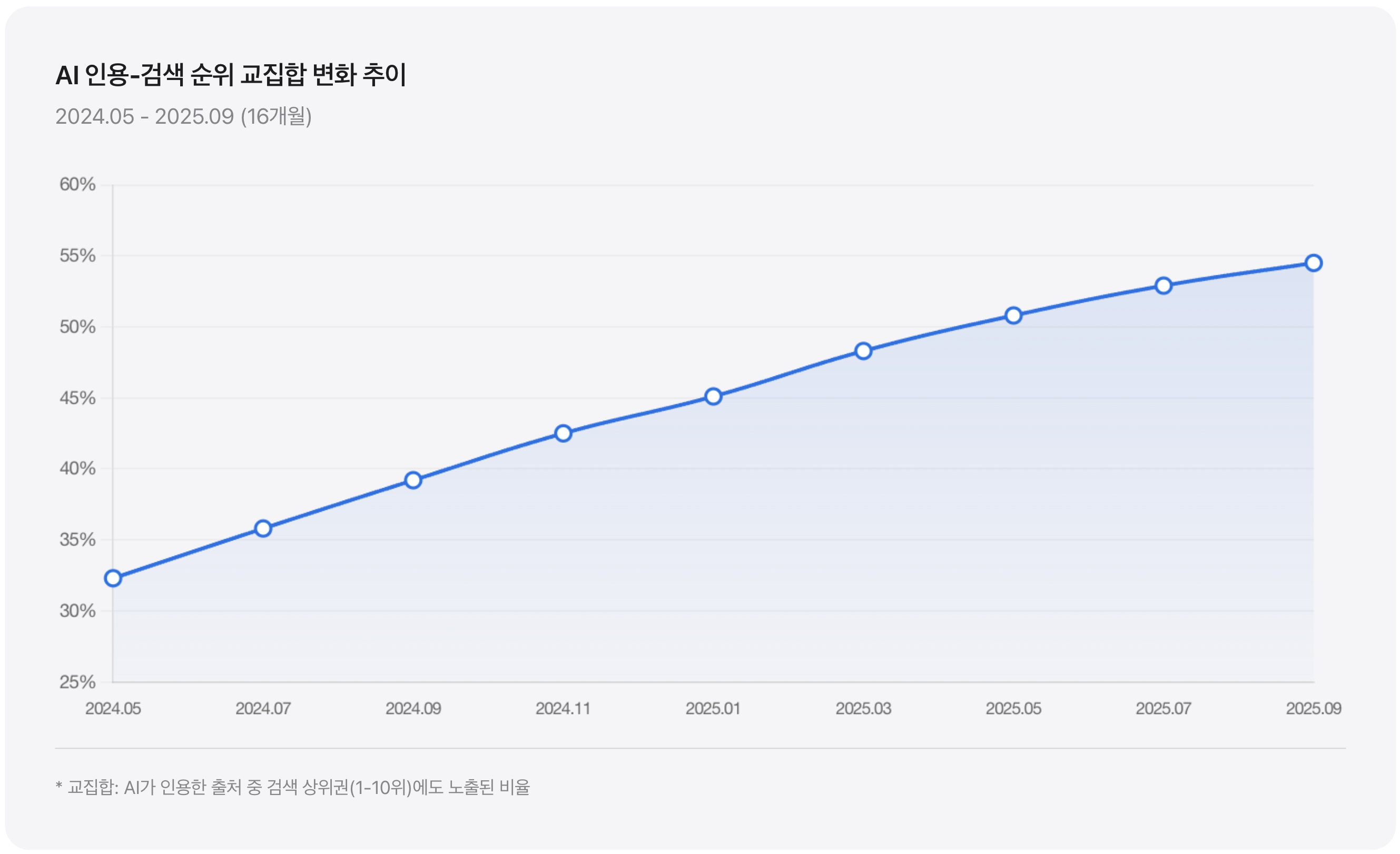16개월 연구 기간 동안 AI 인용 출처와 검색 순위의 교집합은 지속적으로 증가했다.