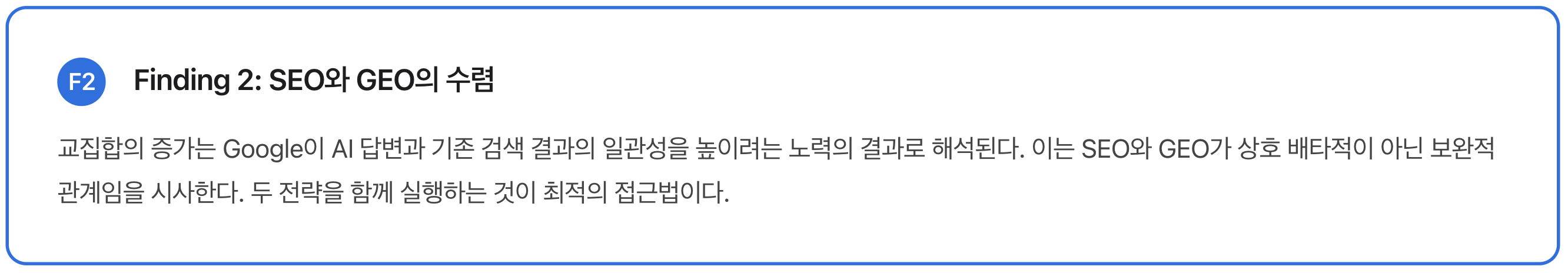 셋째, SEO와 GEO의 수렴 트렌드가 관찰되었다. 교집합이 16개월간 68% 증가했다는 것은 두 영역이 장기적으로 통합될 가능성을 시사한다.