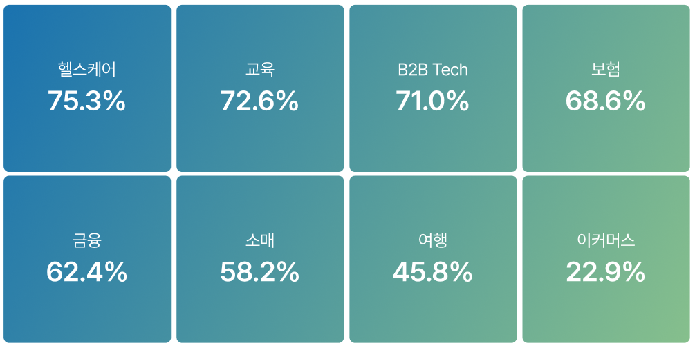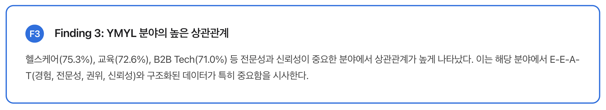 AI 인용과 검색 순위의 상관관계는 산업별로 큰 편차를 보였다. 특히 YMYL(Your Money Your Life) 분야에서 높은 상관관계가 관찰되었다.