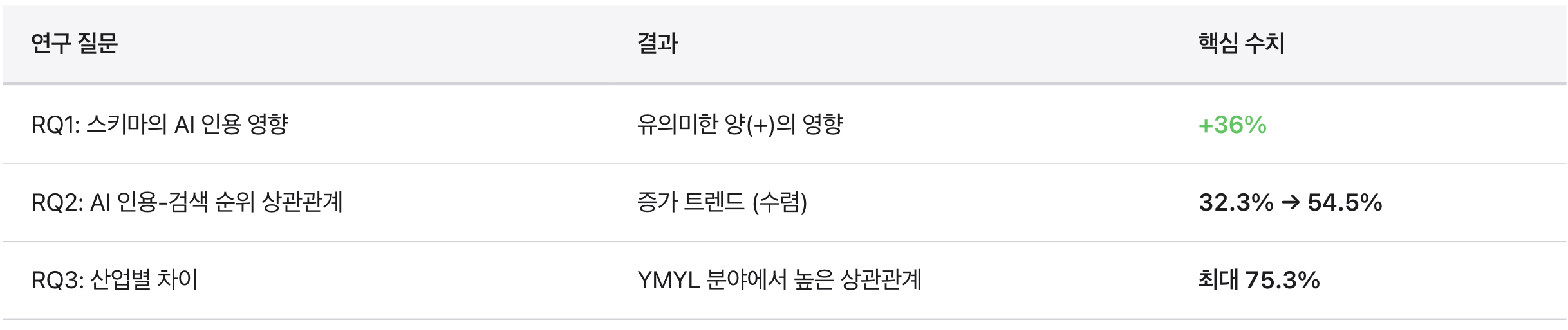 본 연구는 BrightEdge의 16개월 종단 연구를 중심으로 스키마 마크업과 AI 인용의 상관관계를 분석했다. 주요 발견은 다음과 같다: