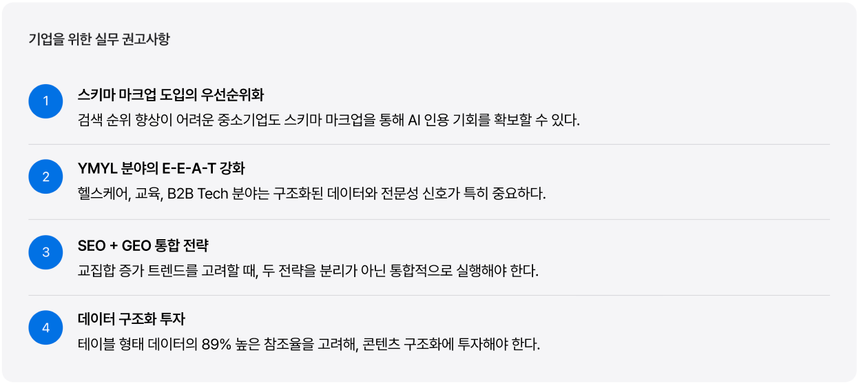 둘째, 구조화된 데이터의 독립적 가치가 확인되었다. 스키마 마크업은 검색 순위와 무관하게 AI 인용 확률을 36% 향상시킨다. 이는 구조화된 데이터가 SEO와 GEO 양쪽에 동시에 기여하는 ‘이중 효과(Dual Effect)’를 갖는다는 것을 보여준다.