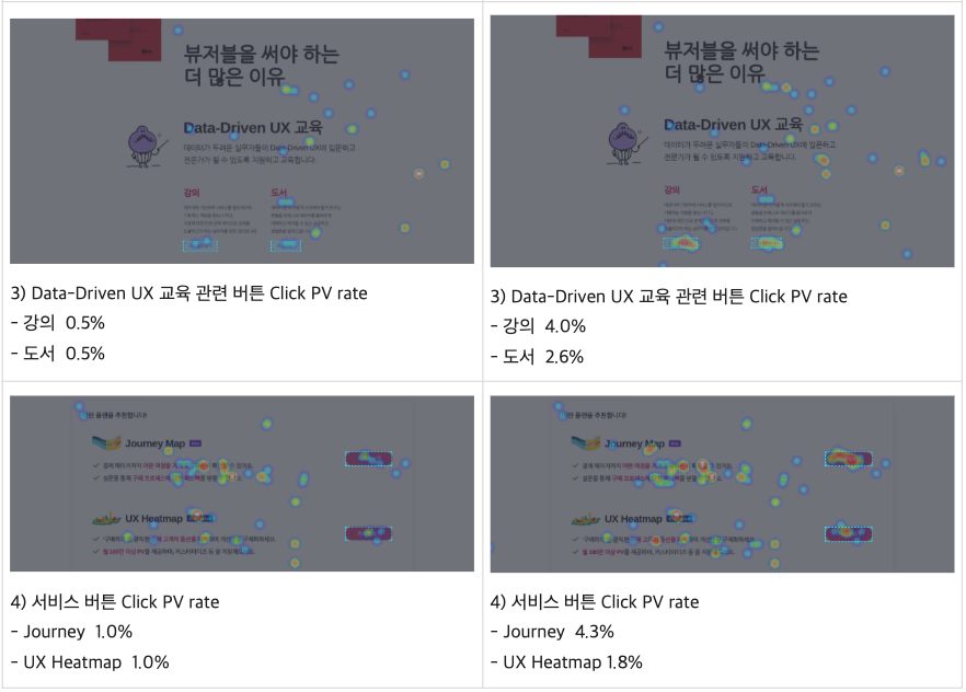또한, Journey map 서비스 자세히보기 버튼 클릭률을 통해 UX Heatmap보다 2.4배 더 많은 관심을 가지고 있다는 것을 확인하였음. 이를 통해, 세미나, 프로모션 혹은 광고 등으로 고객의 관심이 서비스 사용까지 이어질 수 있도록 전략을 세운다면 고객 관심을 바탕으로 Journey map 사용자를 늘릴 수 있는 상황임을 확인함.
