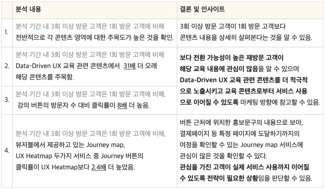 3회 이상 재방문한 고객이 특히 Data-Driven UX 교육 관련 콘텐츠에 많은 관심을 보이고 있어,