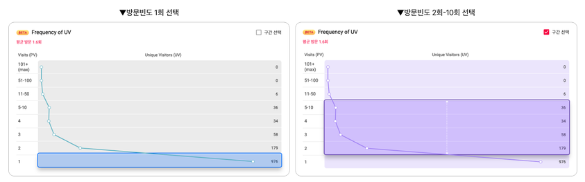– 2회 이상 방문한 사용자를 대상으로 쿠폰 이벤트와 같이 구매 전환을 강력하게 이끌 수 있는 마케팅을 진행해 볼 수 있어요.