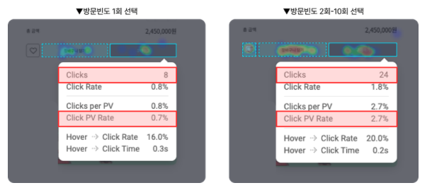 ② 방문 빈도에 따른 “구매하기”버튼의 클릭 수 및 클릭률 비교