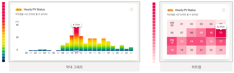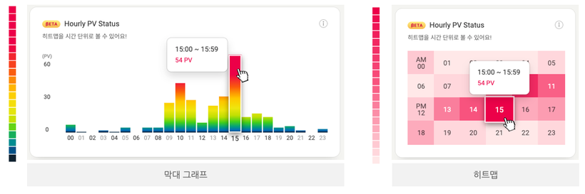 *Hover시, 툴팁 제공 (상세한 시간대와 해당 시간동안 수집된 PV 수 조회 가능)