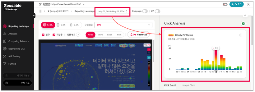 일별 시간 세그먼트는 UX Heatmap의 Reporting Heatmaps와 Segmenting CTA에서 활용할 수 있습니다.