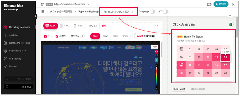 2) 히트맵을 시간 단위로 조회할 수 있습니다.