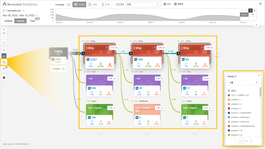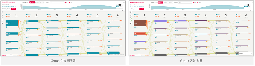 여정 흐름을 컬러로 구별할 수 있어, 여정의 패턴이 한눈에 파악된다는 점이 ‘Group’ 기능의 가장 큰 장점입니다.