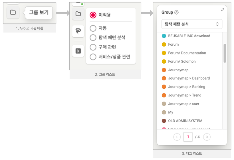 – 태그명과 컬러 구별을 통해, 그룹 목적에 따라 여정의 패턴을 한눈에 파악할 수 있습니다.