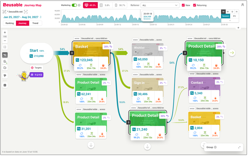 원하는 분석 기간 및 세그먼트 설정 후, 여정을 자유롭게 조회하며 고객의 탐색 패턴을 확인합니다.