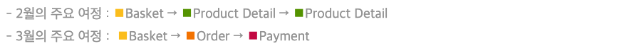 2월과 달리 3월은 장바구니로부터 바로 주문 및 결제로 이어지도록 여정이 개선된 것을 알 수 있습니다.