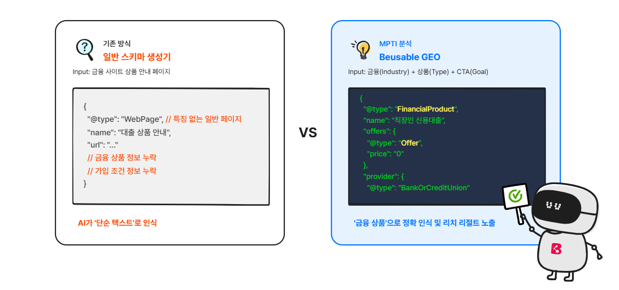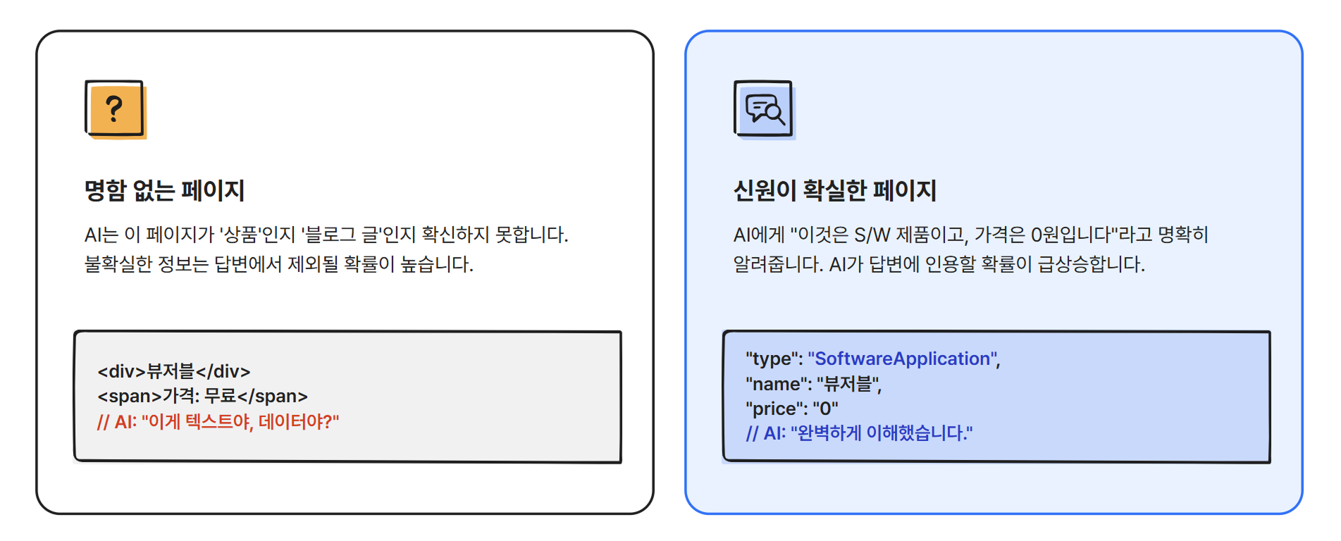 앞의 시나리오를 통해 보셨듯이, AI 답변 후보군에 들어가도록 GEO를 최적화하는 것이 필수가 되었습니다. 브랜드나 웹사이트 정보를 AI가 쉽게 이해하도록, 여러 기업에서 스키마 태그를 수정하고 있습니다.