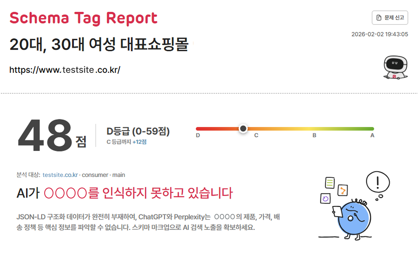 분석 리포트를 통해 AI가 웹사이트를 어떻게 인식하고 있는지, 답변에 노출될 가능성이 어느 정도인지 파악할 수 있었어요. 우리 쇼핑몰은 48점 D등급으로, AI가 인식하기 어려운 웹사이트라는 점을 알게 되었죠.