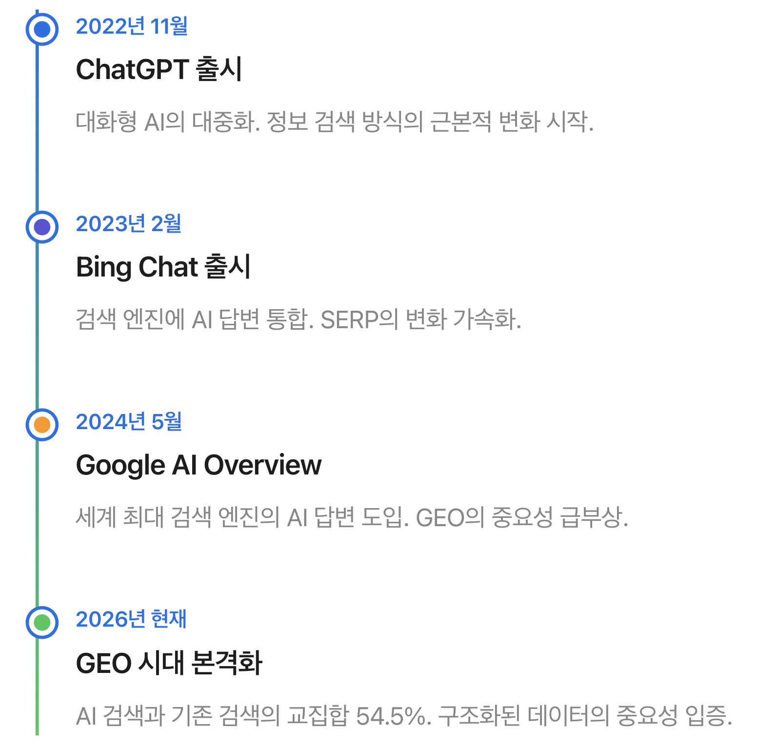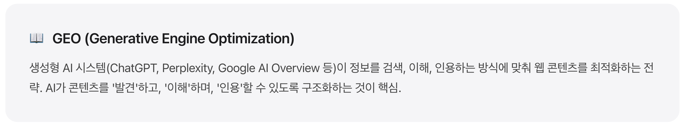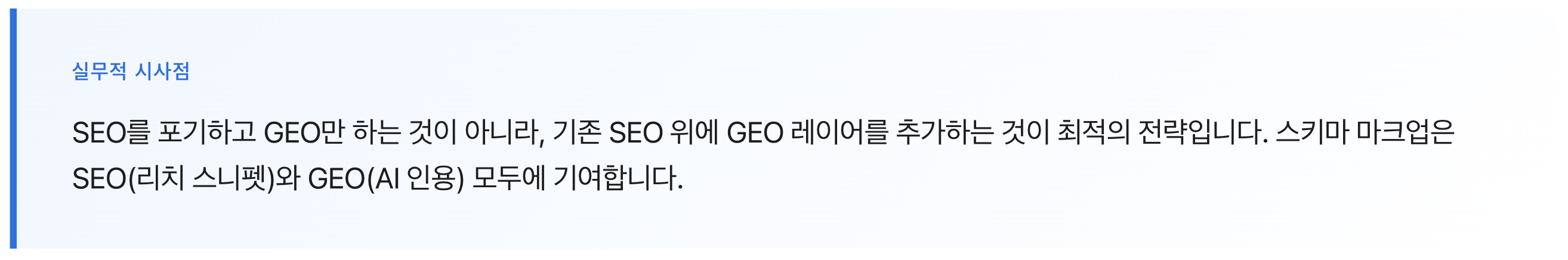 지금 GEO에 투자하는 기업은 AI 검색 시대의 선점 효과를 누릴 것이며, 그렇지 않은 기업은 점점 더 ‘보이지 않는’ 존재가 될 위험이 있습니다.