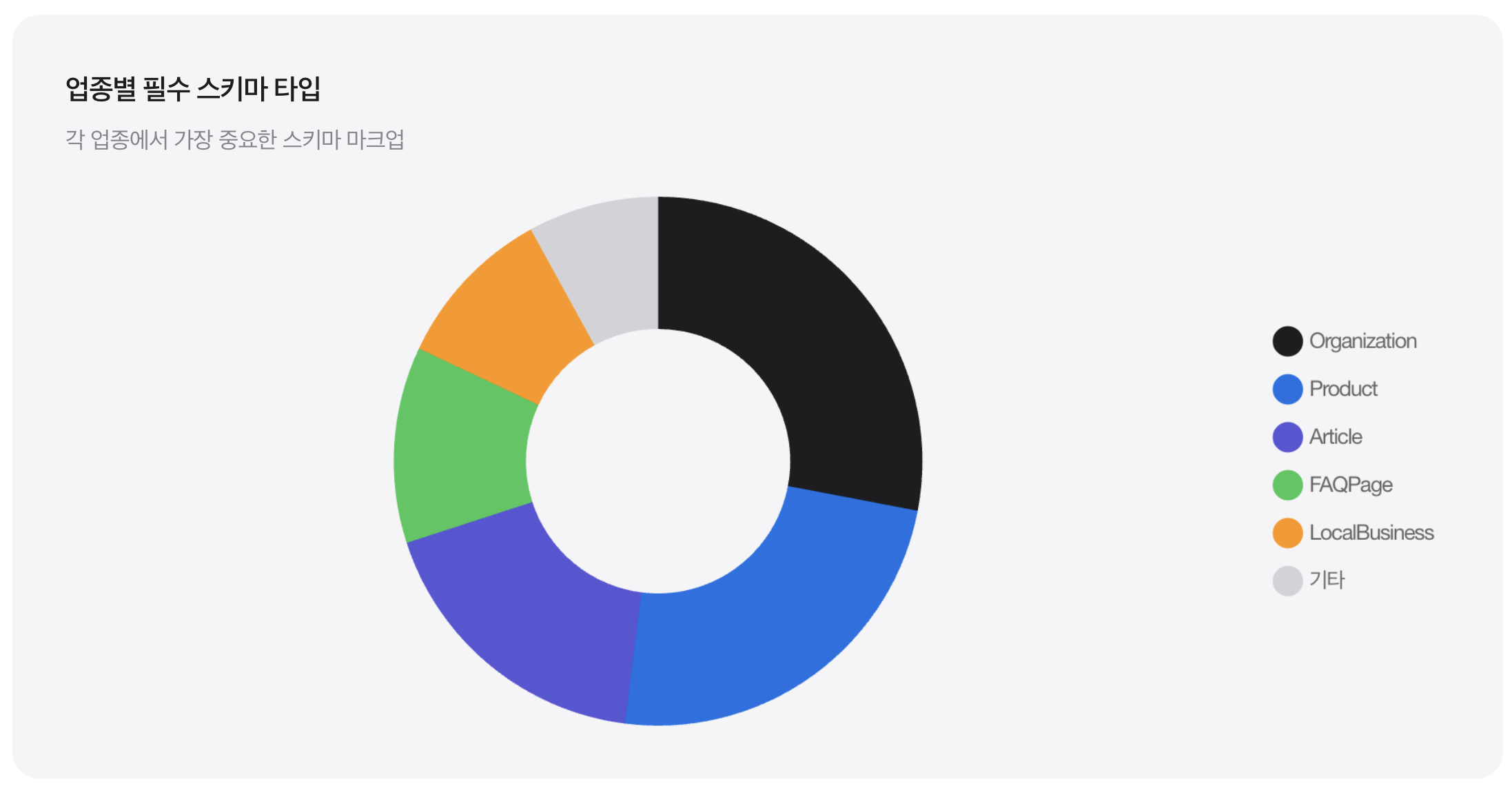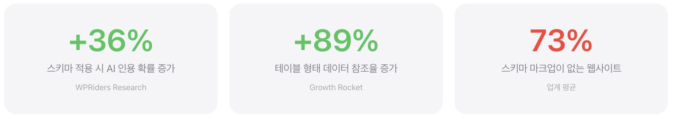 WPRiders의 연구에 따르면, 스키마 마크업이 적용된 페이지는 그렇지 않은 페이지에 비해 AI 인용 확률이 36% 더 높습니다. 또한 Growth Rocket의 분석에서는 테이블 형태로 구조화된 데이터가 89% 더 높은 참조율을 보였습니다.