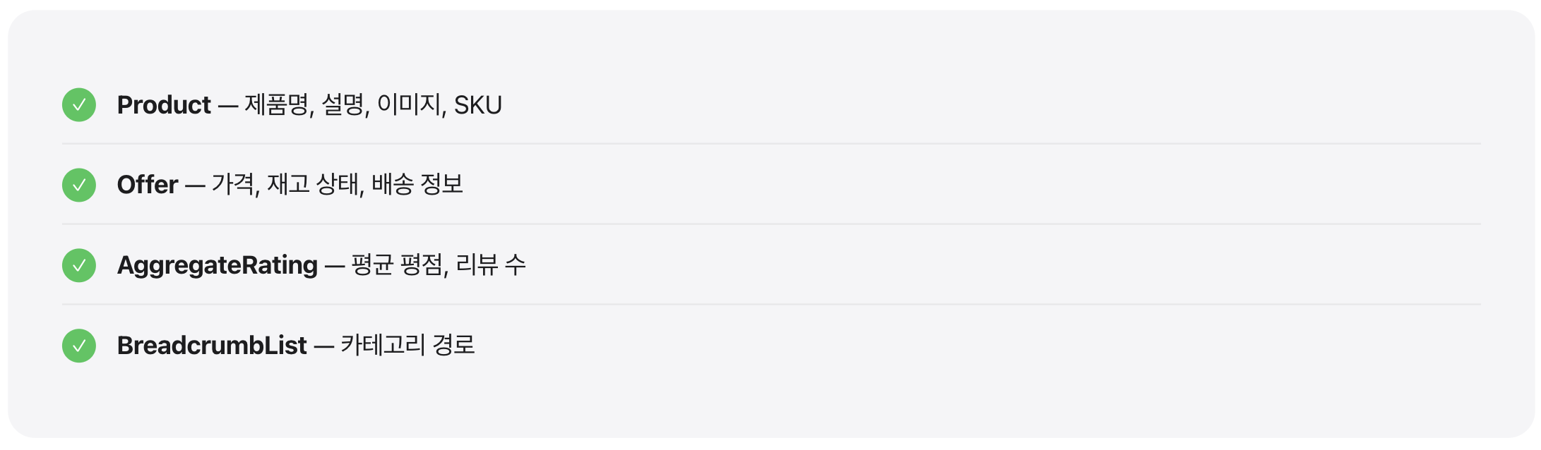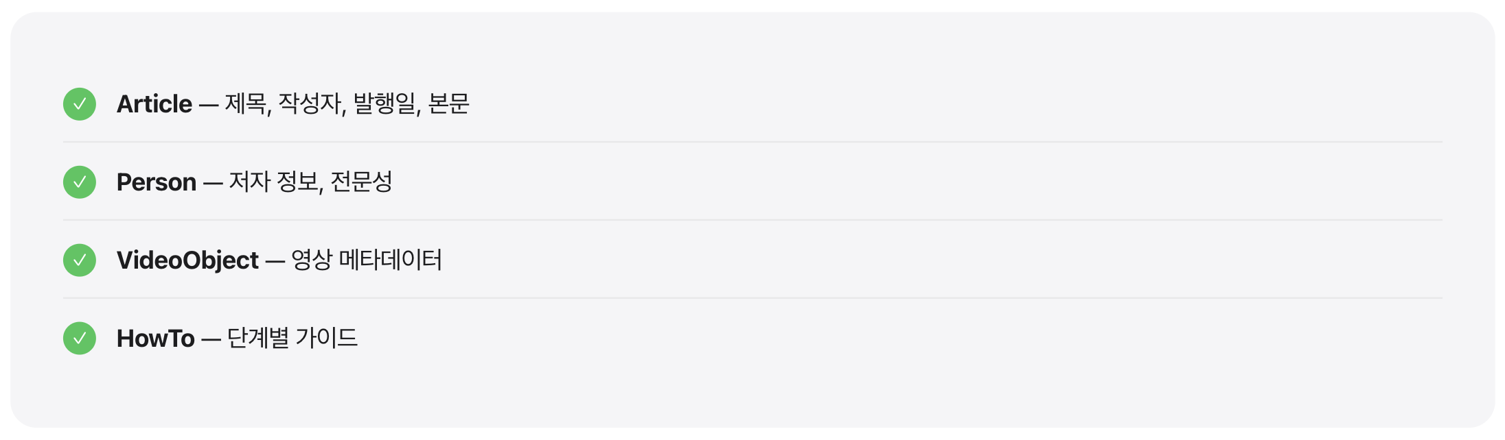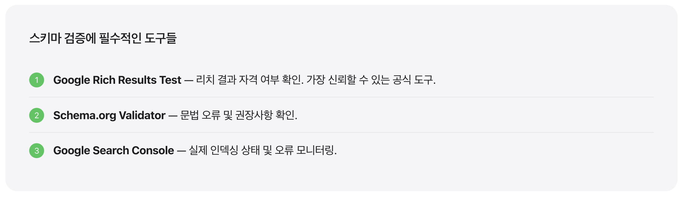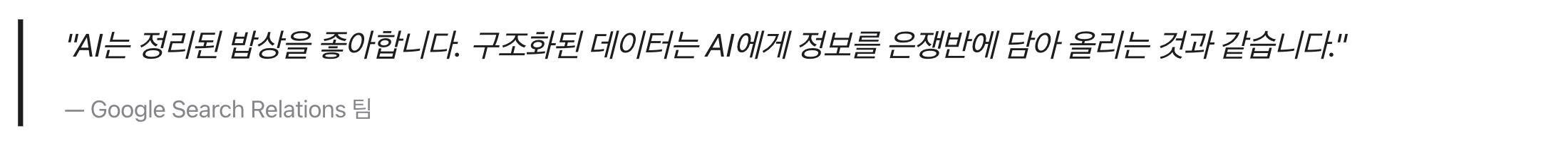 당시에는 주로 검색 결과의 ‘리치 스니펫(Rich Snippet)’을 위한 것이었지만, AI 시대에 들어 그 중요성이 급격히 증가했습니다. 기계가 웹 콘텐츠를 ‘이해’하기 위한 공용어가 된 것입니다.