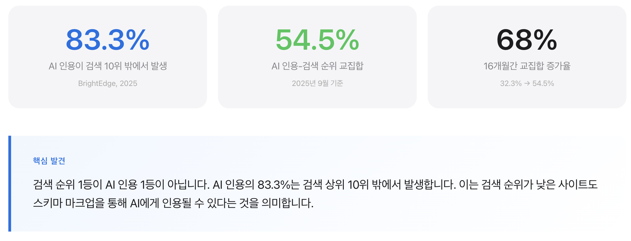 중요한 점은, GEO가 SEO를 대체하는 것이 아니라 보완한다는 것입니다. BrightEdge의 연구에 따르면, AI 인용 출처와 검색 순위의 교집합이 16개월간 32.3%에서 54.5%로 증가했습니다. 이는 SEO와 GEO가 점점 더 수렴하고 있음을 보여줍니다.