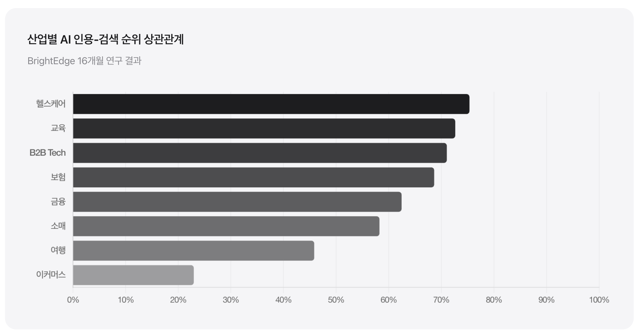 AI 인용과 검색 순위의 상관관계는 산업별로 큰 차이를 보입니다. YMYL(Your Money Your Life) 분야일수록 상관관계가 높게 나타났습니다.