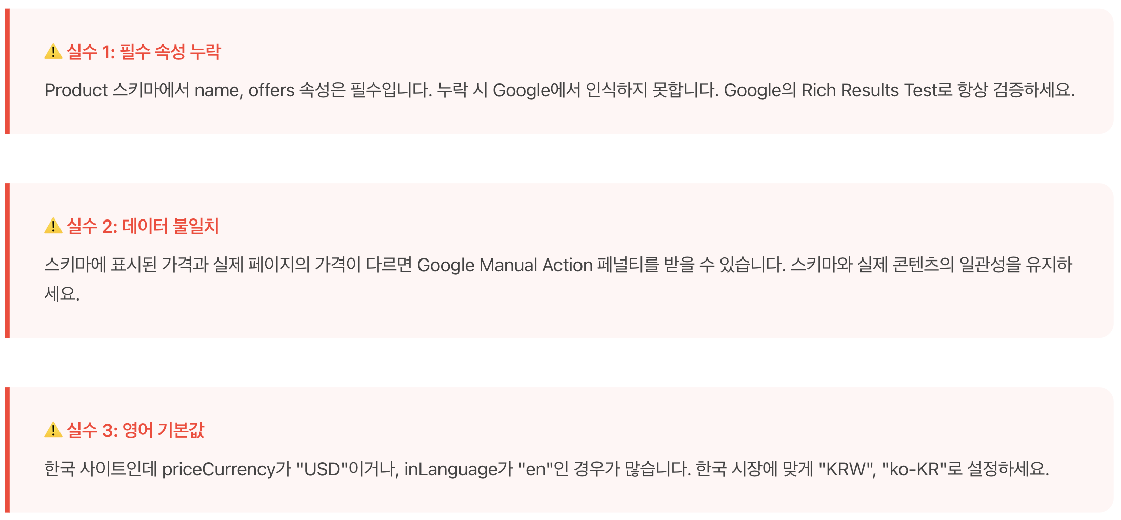 Google은 스키마 마크업과 실제 콘텐츠의 불일치를 기만 행위(Deceptive Practice)로 간주합니다. 의도적이든 아니든, 이는 Manual Action 페널티로 이어질 수 있습니다.