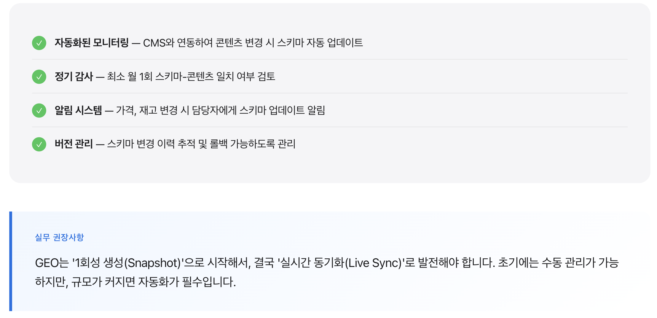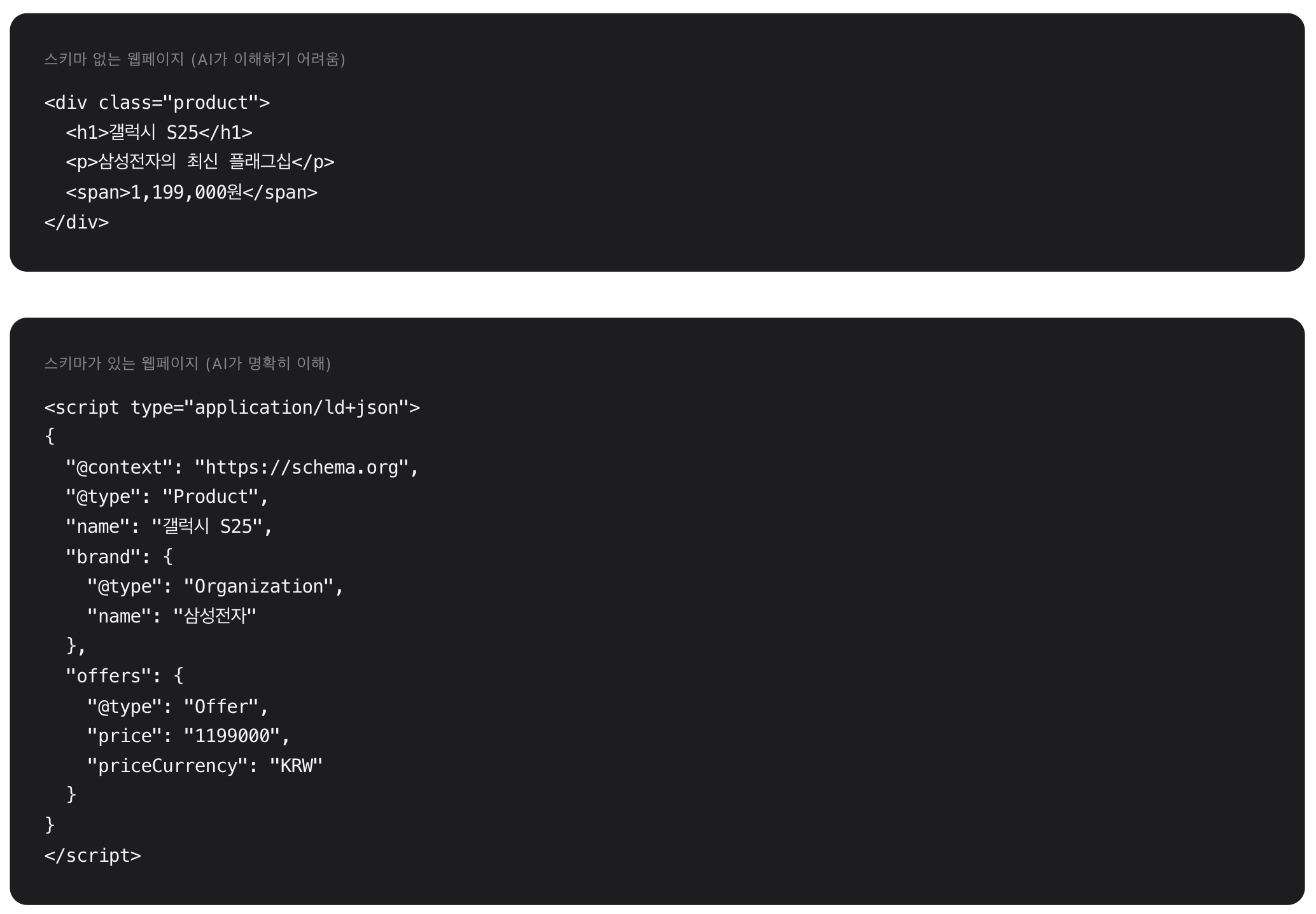 두 번째 예시에서 AI는 “삼성전자”가 브랜드이고, “갤럭시 S25″가 제품명이며, 가격이 “1,199,000원”이라는 것을 명확히 이해합니다. 이러한 명확성이 AI 인용의 가능성을 높입니다.