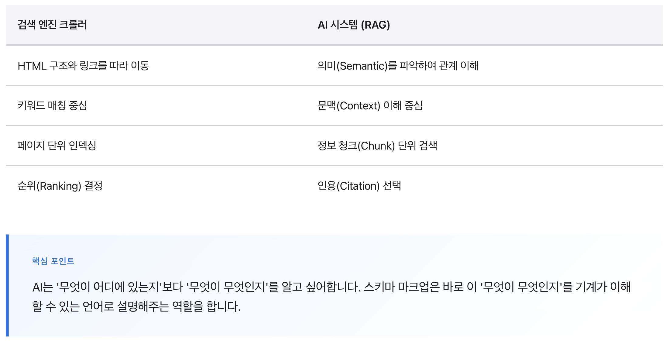 기존 검색 엔진 크롤러와 AI 시스템의 정보 처리 방식에는 근본적인 차이가 있습니다.