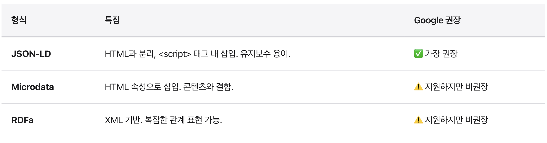 구조화된 데이터를 웹페이지에 삽입하는 방법은 세 가지가 있습니다. 현재 업계 표준은 JSON-LD입니다.
