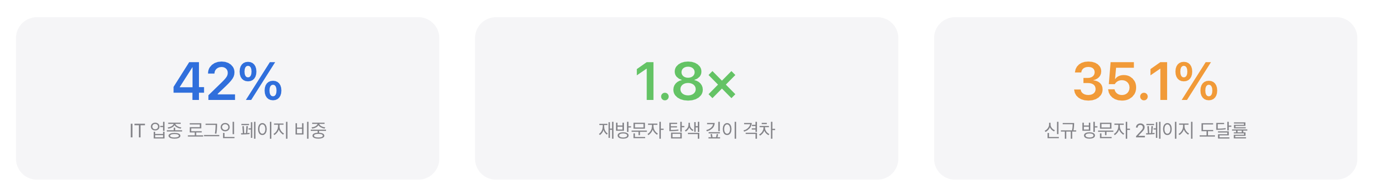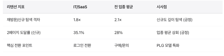 IT/SaaS에서 재방문자의 탐색 깊이는 신규의 1.8배입니다. 전 업종 평균(2.1배)보다 낮은데, 이는 IT/SaaS 신규 방문자도 비교적 깊이 탐색하기 때문입니다(Deep Diver 패턴).